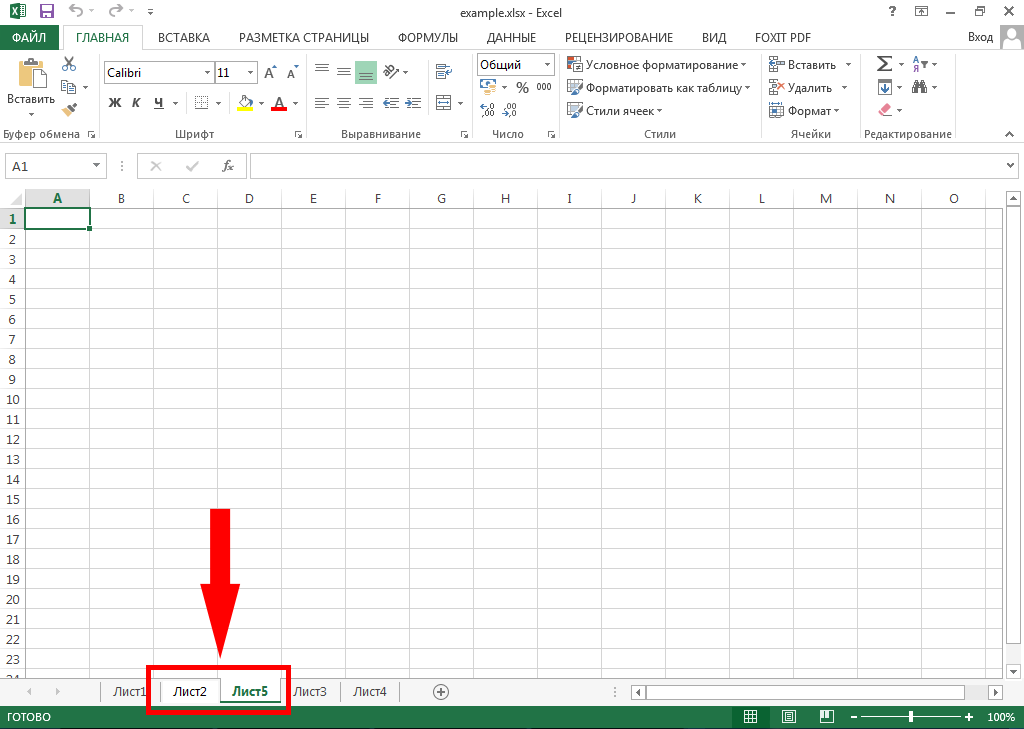 Обратите внимание на расположение не по порядку (на снимке ниже нумерация 1, 2, 5, 3, 4). Это связано с тем, что новый лист создаётся не в конце списка, а справа от последнего открытого листа. Указанный выше порядок говорит о том, что до создания листа №5 был открыт лист №2.