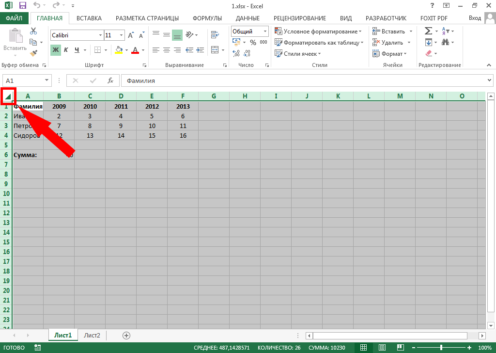 Для выбора всех ячеек листа нажмите на треугольник слева от нумерации столбцов.