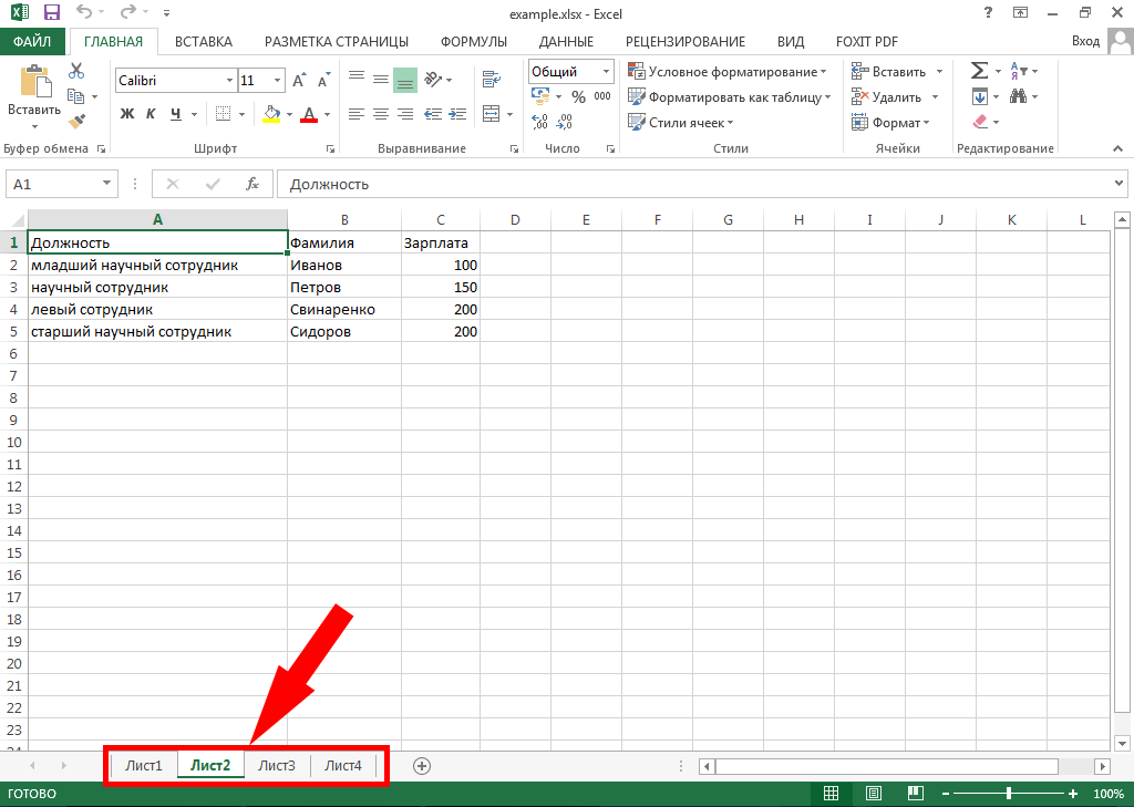 Листы таблицы Excel
