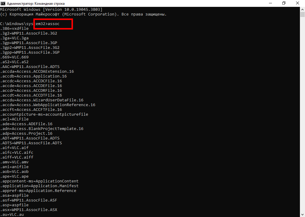 Результат выполнения команды - имя исполняемого файла (программы), который используется для открытия файла указанного расширения. На снимке ниже видно, что имя файла vlc.exe.