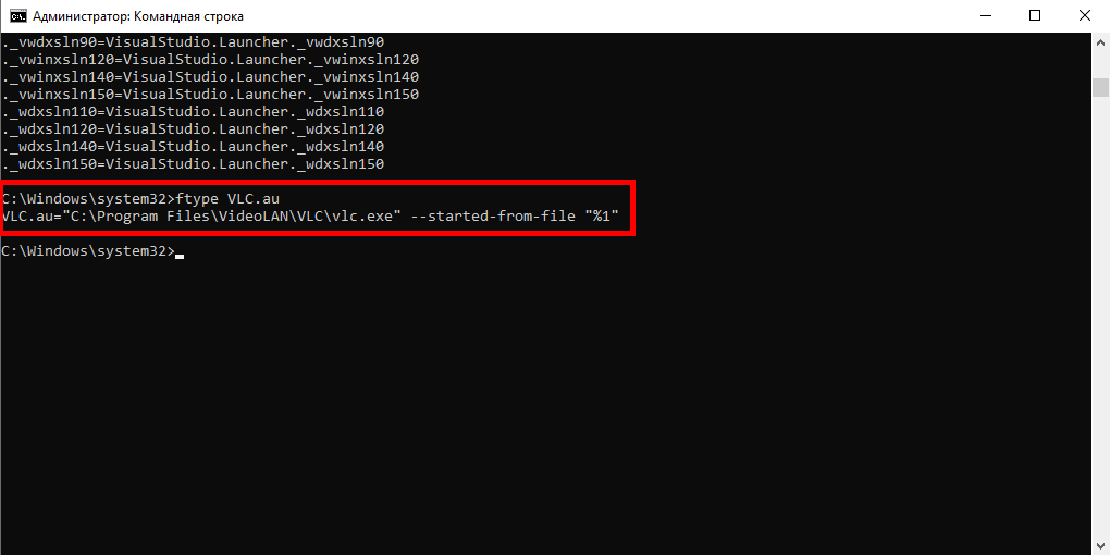 Например, для просмотра программы, которая ассоциирована с расширением au, необходимо из строчки ".au=VLC.au" взять имя идентификатора после знака = и через пробел написать его после команды ftype: