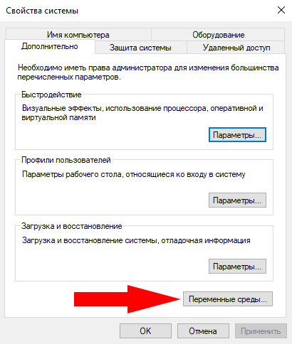 В свойствах системы выберите переменные среды.