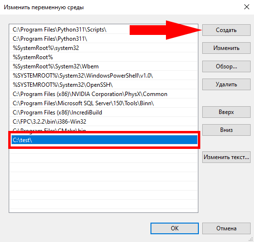 Далее необходимо нажать на кнопку "создать" и ввести адрес папки. В нашем случае это C:\test.