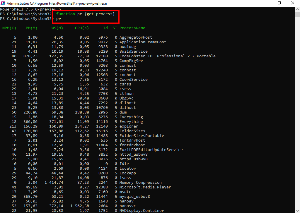 На снимке ниже из командлета "get-process" создана функция с именем "pr". Для вызова функции достаточно указать её имя, в моём случае - "pr".
