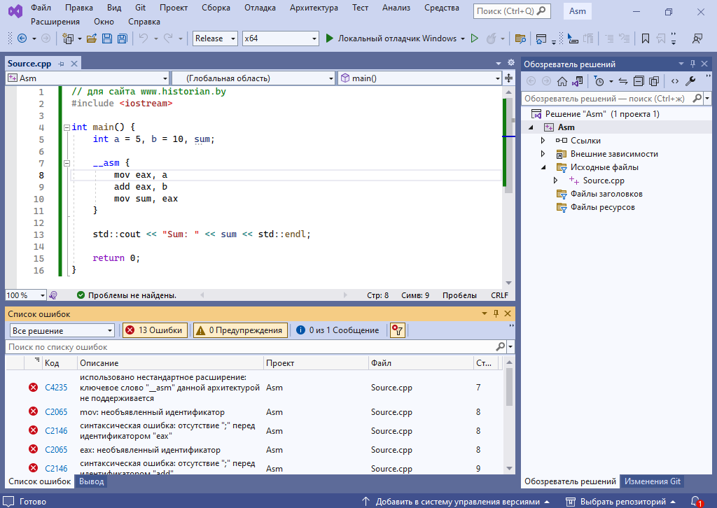 При попытке скомпилировать этот код под 64-битную платформу (x64) интегрированная среда разработки Microsoft Visual Studio 2022 выдаст ошибки С2065, С2146 и C4235.