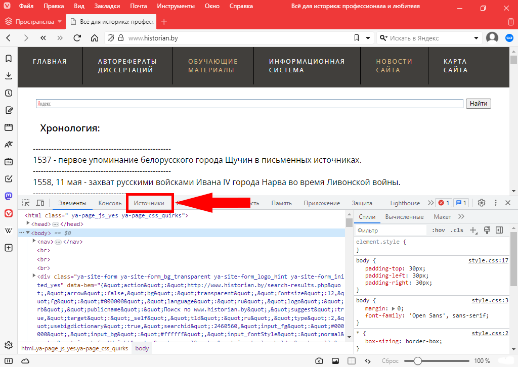 Для просмотра стилей, которые использует открытая веб-страницы, перейдём на вкладку "Источники".