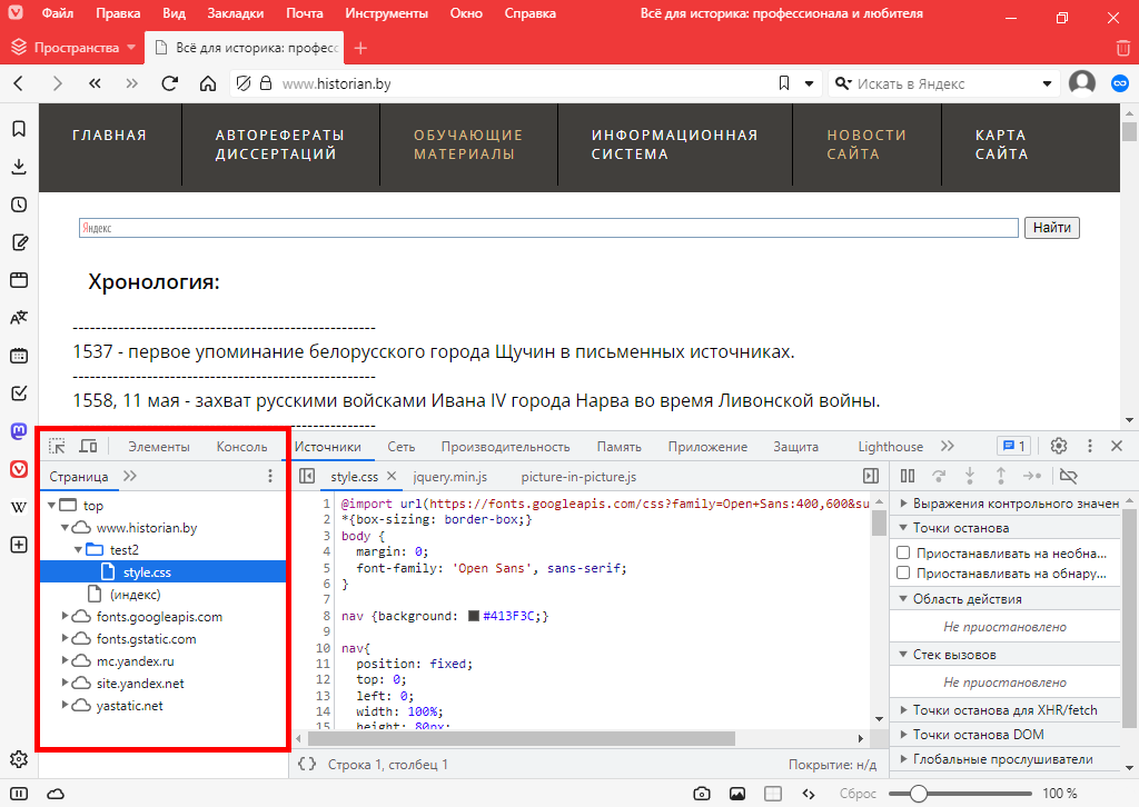 На вкладке "Источники" можно просмотреть не только используемые стили (на снимке это файл style.css), но и любые другие подключённые файлы. Именно этим объясняется наличие в списке сайтов fonts.googleapis.com, fonts.gstatic.com, mc.yandex.ru, site.yandex.net, yastatic.net.