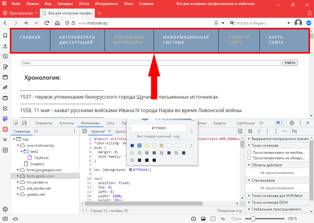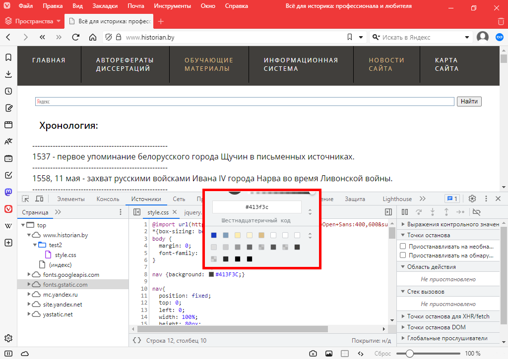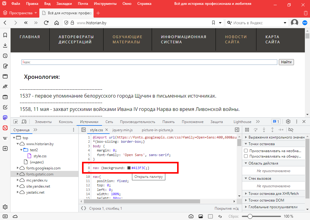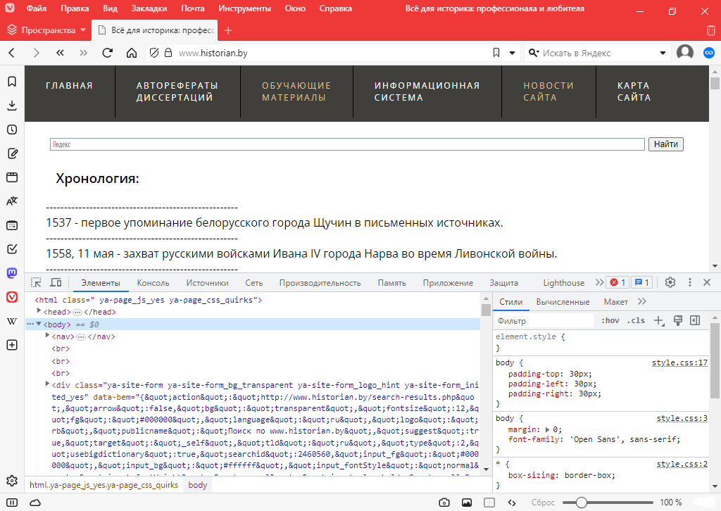 Сначала необходимо открыть сайт, на котором предполагается отладка CSS-кода, а потом запустить консоль разработчика. Я открыл сайт https://www.historian.by в браузере Vivaldi, затем для открытия консоли разработчика нажал клавишу F12.