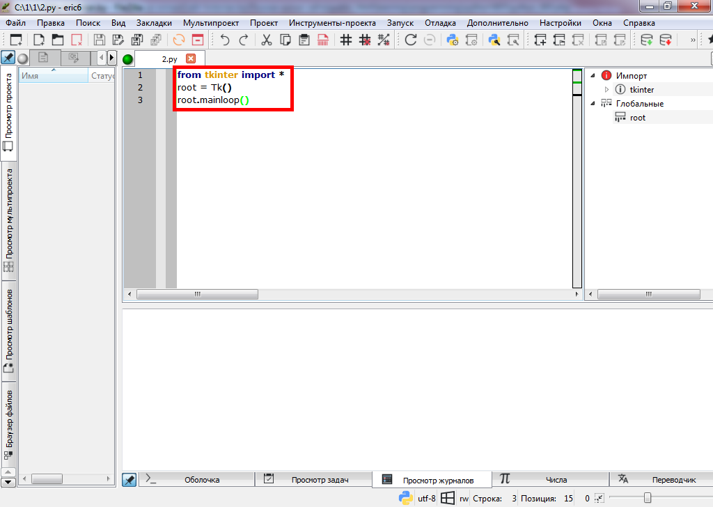 Строчкой "from tkinter import *" мы импортируем (подключаем) модуль tkinter, чтобы его можно было использовать в нашей программе. Cтрочка "root = Tk()" создаёт корневое окно графического интерфейса пользователя с помощью функции Tk(). Строчка "root.mainlop()" создаёт бесконечный цикл окна, т.е. программа будет ожидать каких-либо действий пользователя. Вместо root можно использовать любое другое имя. Важно, чтобы оно везде совпадало.