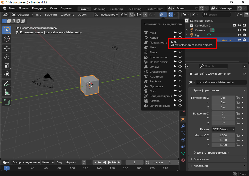 Например, для передвижения объекта (в данном случае куба) наберите следующий код: