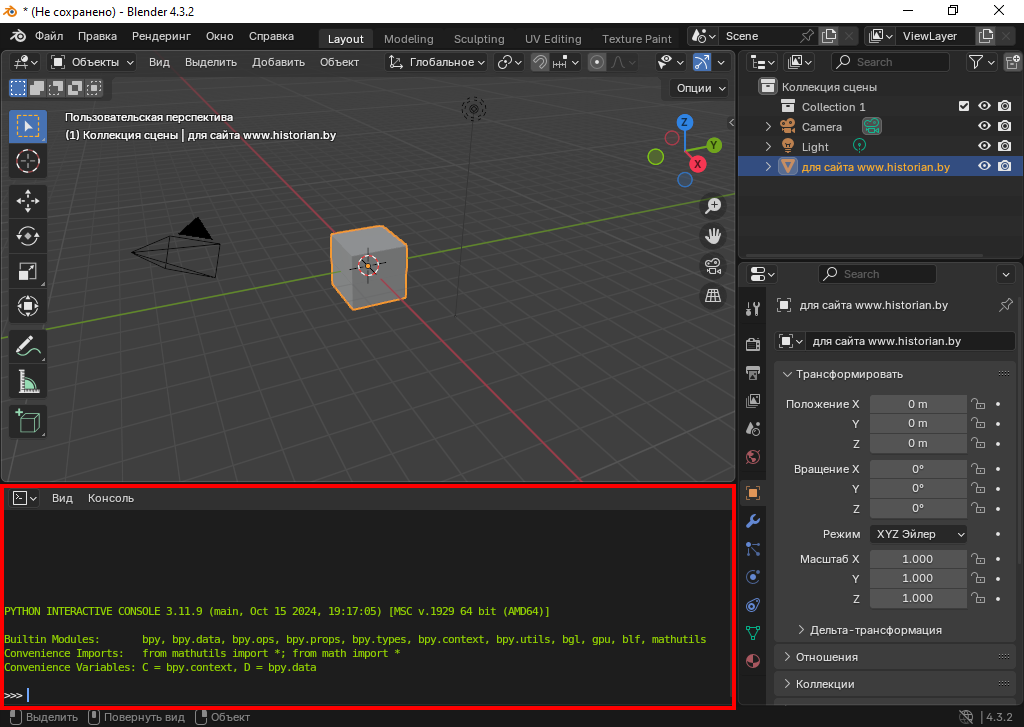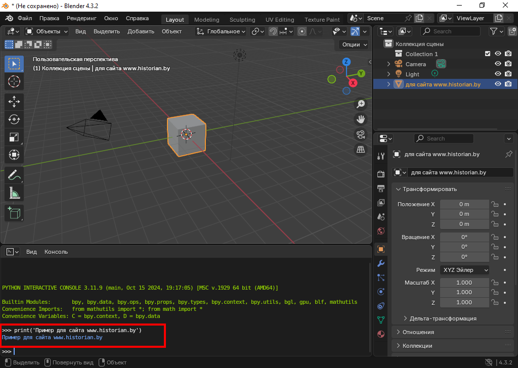 Для проверки работы Python в Blender наберём команду, которая выводит в консоль одно предложение
