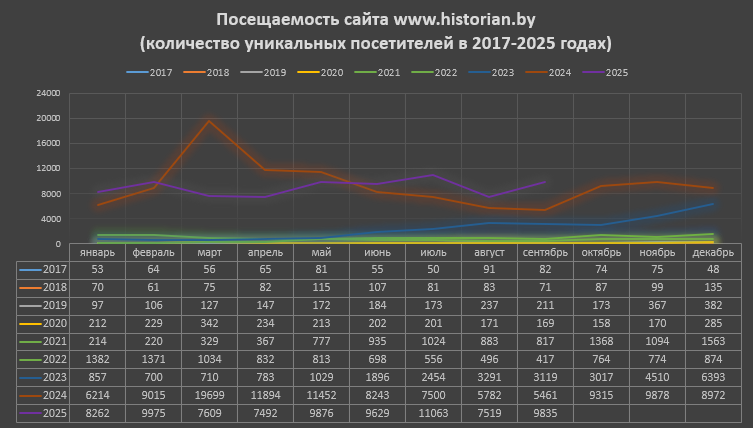 Посещаемость сайта www.historian.by (январь 2017 - сентябрь 2025):