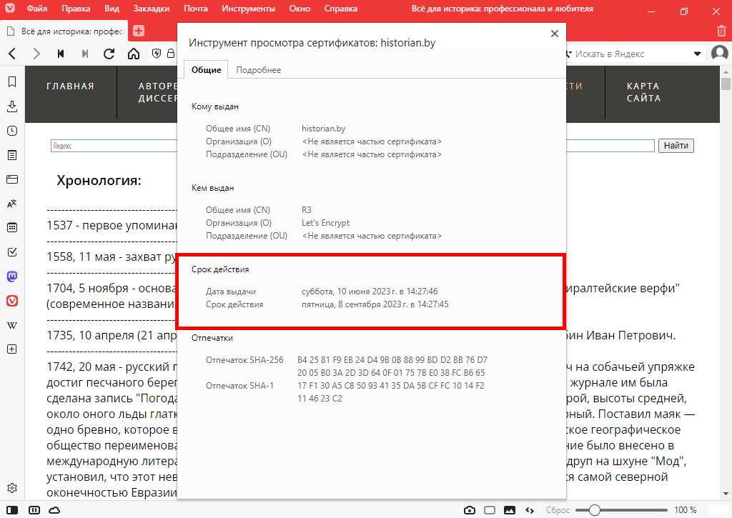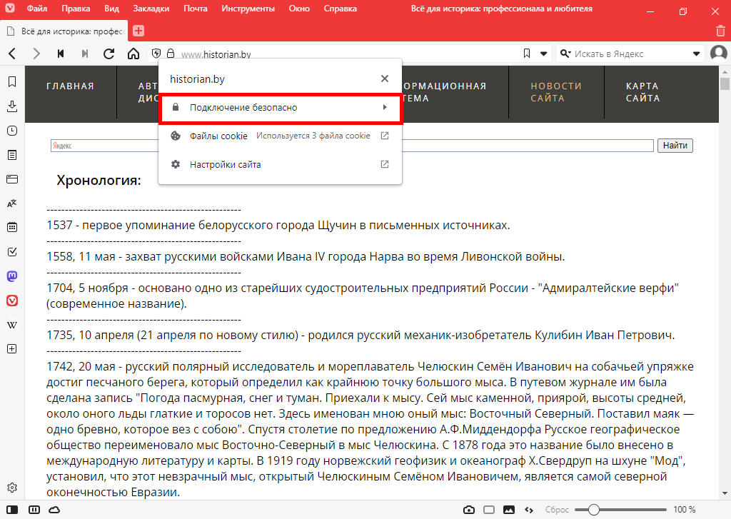 При щелчке по замку появится всплывающее окошко с дополнительной информацией (используемые на сайте сертификат, куки и настройки сайта в параметрах браузера). При переходе по ссылке "Подключение безопасно" можно ознакомиться со статусом сертификата.
