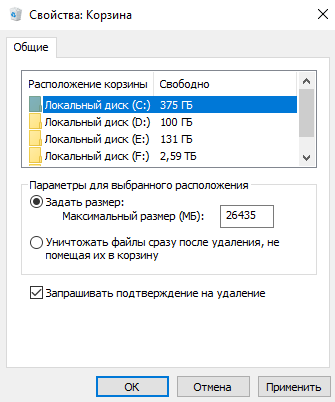 Шаг 1. Windows 10 позволяет настроить размер корзины для каждого раздела жёсткого диска, при этом можно включить запрос подтверждения удаления файлов и безвозвратное уничтожение файлов без помещения их в корзину. Сделать это можно при помощи щелчка правой кнопкой мыши на иконке корзины на рабочем столе. Все параметры представлены на снимке ниже и не нуждаются в дополнительных пояснениях.