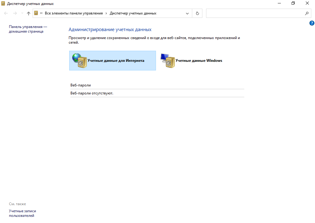 Диспетчер учётных данных позволяет управлять учётными записями и паролями в зашифрованном виде, которые используются для доступа к сайтам и сетевым ресурсам, в том числе с помощью автоматического входа. С его помощью можно добавлять, изменять и удалять учётные записи и пароли.