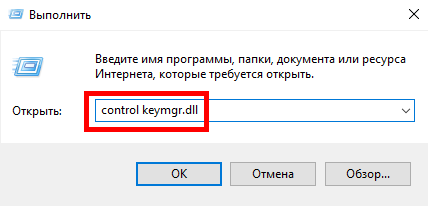 1. нажмите Windows + R и в диалоговом окне «Выполнить» введите «control keymgr.dll» (без кавычек).