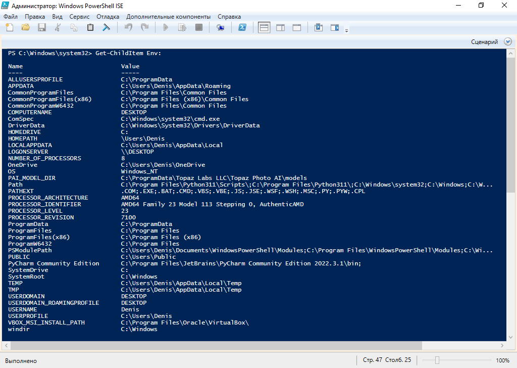 Для получения информации о переменных окружения текущего сеанса PowerShell можно воспользоваться командлетом Get-ChildItem.