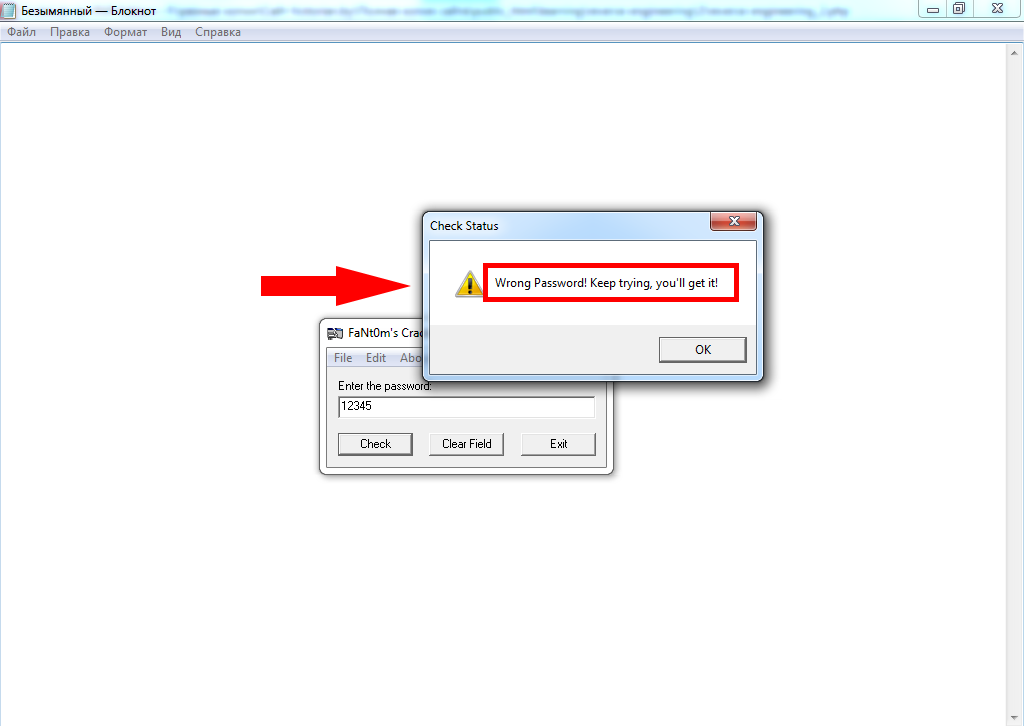 Для нас представляет интерес текстовое поле, куда вводится серийный номер, и кнопка "Check" для проверки серийного номера. Давайте введём любые произвольные символы и попробуем зарегистрировать программу. Первая попытка оказалась неудачной. Обратим внимание на текст сообщения, которое появляется после ввода неправильного серийного номера - "Wrong Password! Keep trying, you'll get it!".