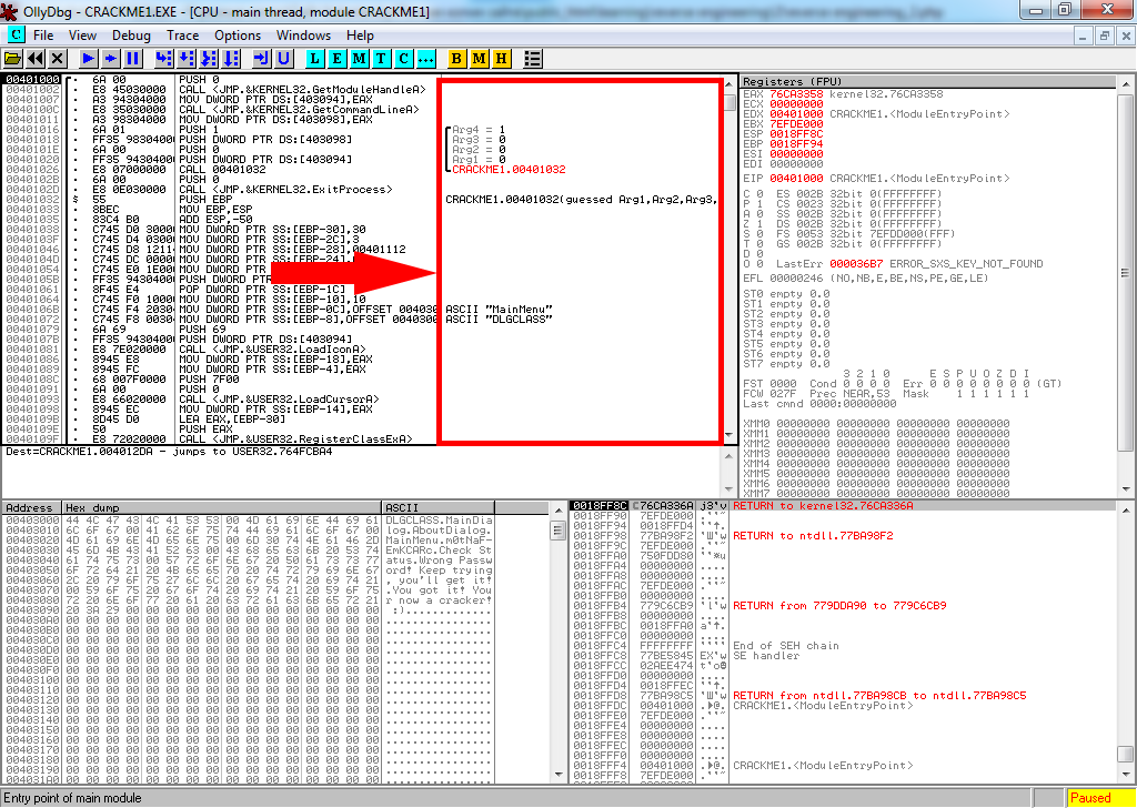 Теперь воспользуемся дебаггером Ollydbg 2.01 и запустим FaNt0m's Crackme #1. Нажмите F3 и выберите наш crackme. Способ взлома этой простой программы заключается в поиске текстовых строк, в которых может содержаться серийный номер. Поскольку мы его не знаем, попробуем поискать фразу "Wrong Password! Keep trying, you'll get it!". Напомню, что так выглядело сообщение о неправильном введённом серийном номере. Искать фразу будем в столбце, выделенном красным цветом.