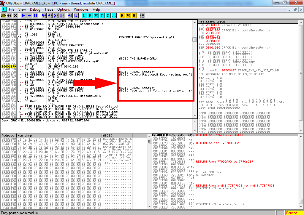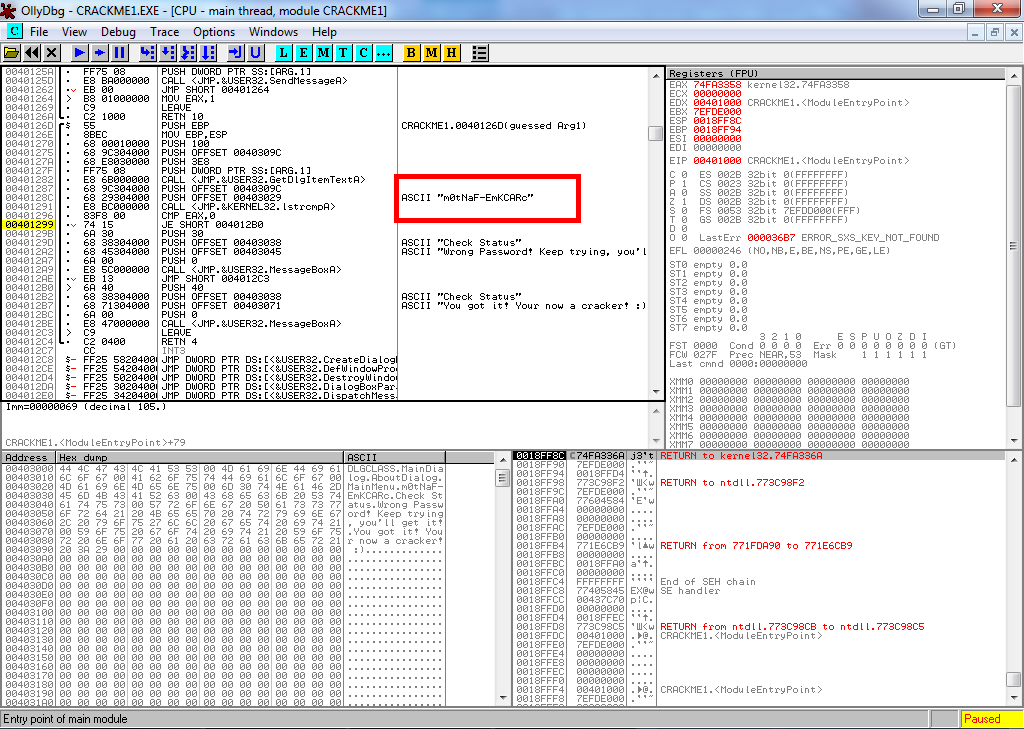 Для данного урока понадобятся программа, требующая серийный номер, и дебаггер для анализа выполнения кода программы. Существует огромное количество т.н. crackme ("взломай меня") - маленьких программ, на которых можно учиться взламыванию защиты программного обеспечения. Я буду использовать FaNt0m's Crackme #1 (ссылка на crackme) и дебаггер Ollydbg версии 2.01.