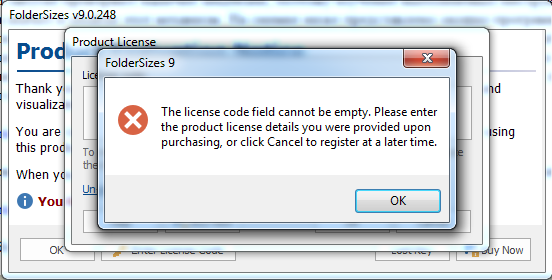 Код мы не знаем, попробуем просто нажать "ОК". В ответ программа сообщает, что поле для ввода кода не может быть пустым.