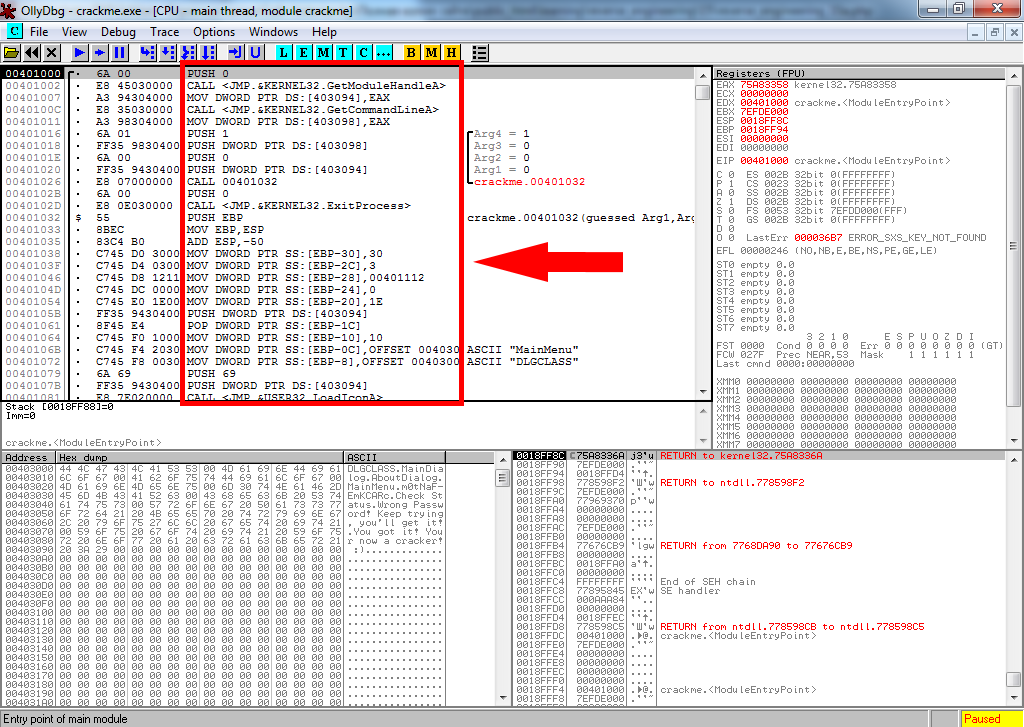 Напомню из прошлого урока, что инструкции ассемблера (мнемоники) это машинный код в удобочитаемом для человека виде, который выполняется микропроцессором. Т.е. каждая строчка с инструкцией ассемблера выполняет какую-то задачу. Для начала откроем в отладчике FaNt0m's Crackme #1 из урока №2 (ссылка на crackme) и посмотрим на третью колонку слева.