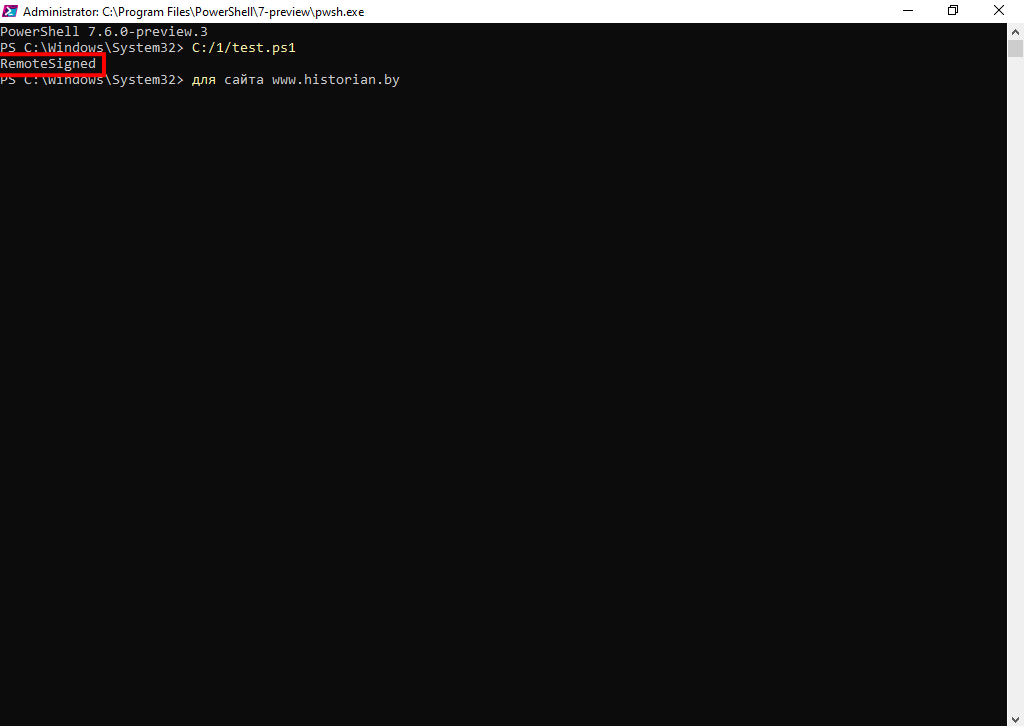 Если создать файл PowerShell с командлетом Get-ExecutionPolicy, тогда при его выполнении будет указана политика выполнения RemoteSigned.