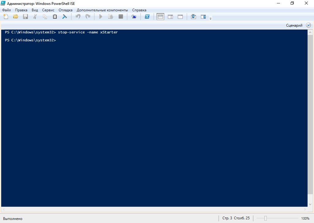 stop-service -name xStarterВ этом примере xStarter это название службы, которая будет остановлена после выполнения командлета Stop-Service.