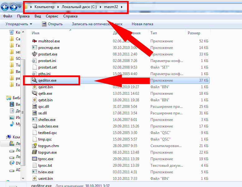 Скачайте с сайта http://www.masm32.com/download.htm MASM32 SDK (интегрированная среда разработки входит в комплект). Установите MASM32 в корень системного диска (обычно С://). После установки MASM32 перейдите в папку "C://masm32". Откройте файл qeditor.exe (интегрированная среда разработки MASM32).