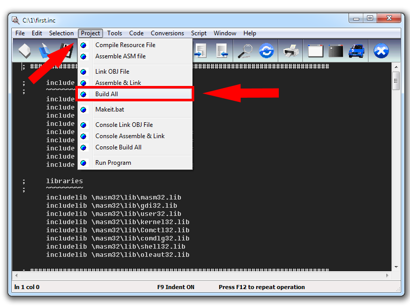 Откройте в интегрированной среде разработки MASM32 любой из двух файлов. В меню "Project" выберите пункт "Build All".