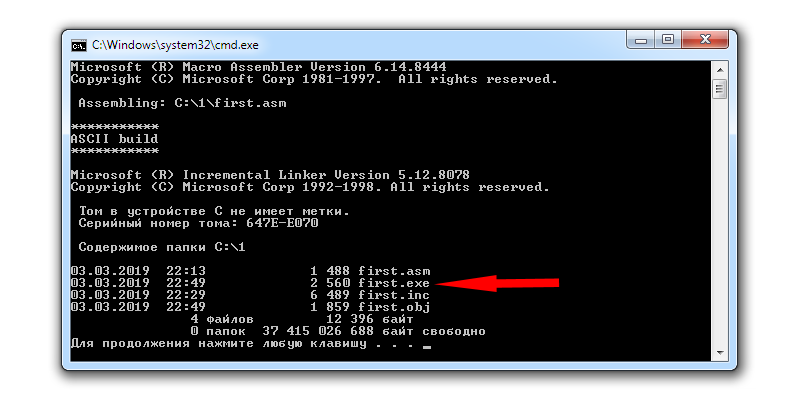 Сохраните код в файл под любым именем с расширением .asm в созданную папку. Я сохранил под именем first.asm. Удалите код из интегрированной среды разработки. Вставьте новый код: