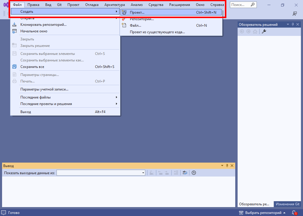 Далее выберем в меню "Файл"->"Создать"->"Проект".