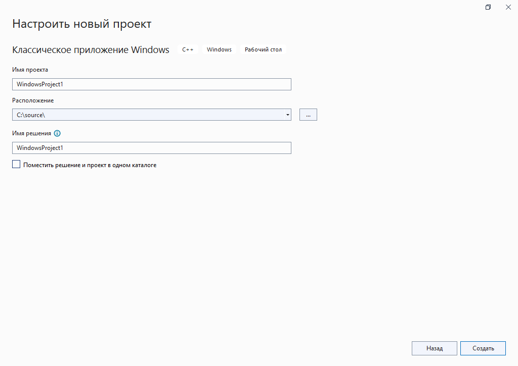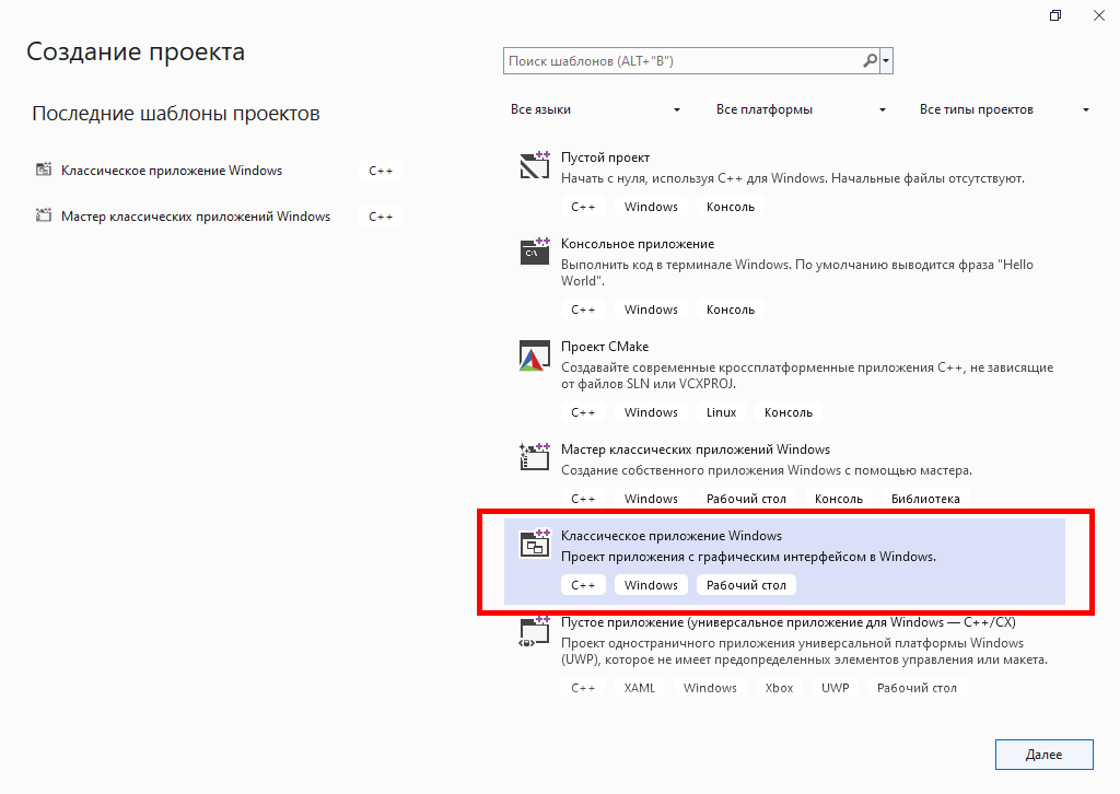 Я воспользуюсь шаблоном "классическое приложение Windows".
