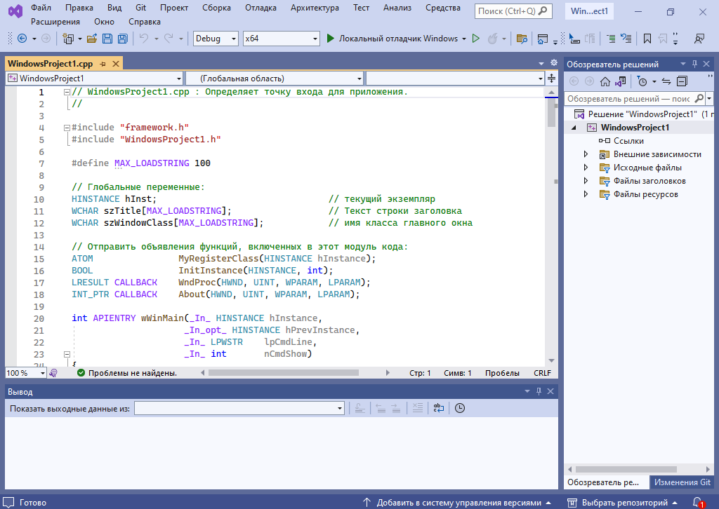 После завершения первоначальной настройки Visual Studio откроет код шаблона.