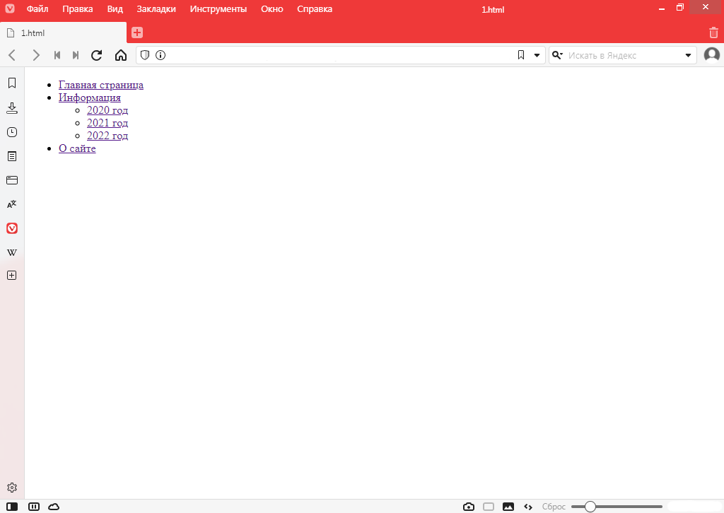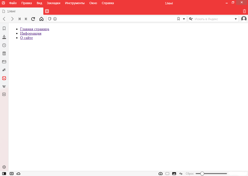 Меню сайта пока выглядит непритязательно, т.к. стили CSS ещё не подключены к нашему меню.