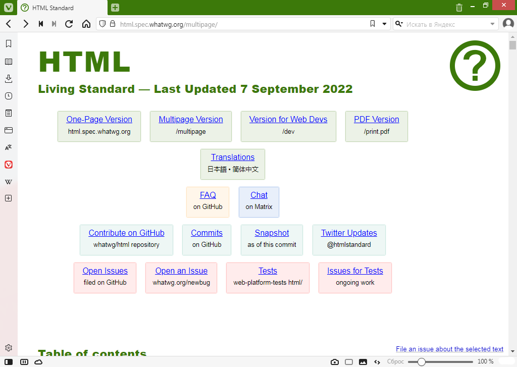 https://html.spec.whatwg.org/multipage/ (по состоянию на 11 сентября 2022 года)