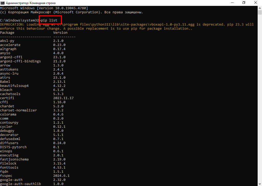 Вывод с помощью pip списка установленных пакетов Python