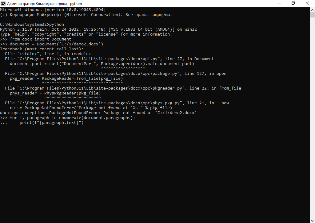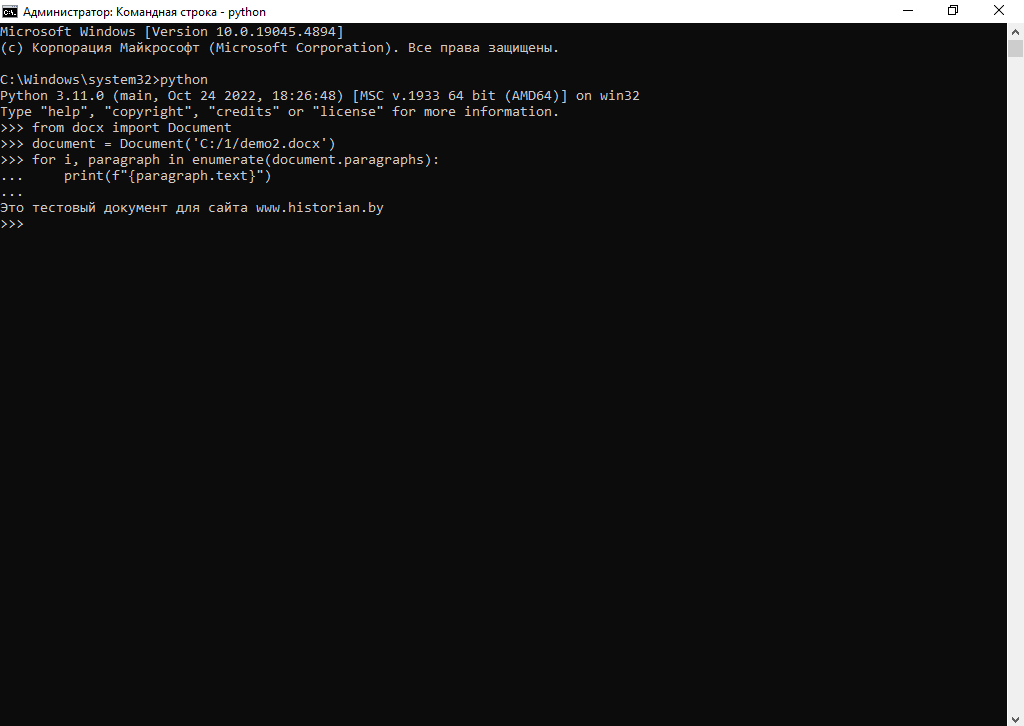 Для чтения существующего документа формата docx в командной строке необходимо набрать команду "python" (без кавычек), затем ввести следующий код: