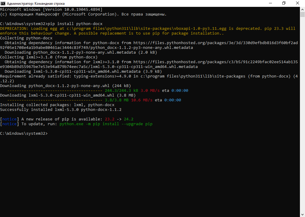 Библиотека python-docx предназначена для работы с файлами формата docx. Для установки библиотеки наберите в командной строке "pip install python-docx".