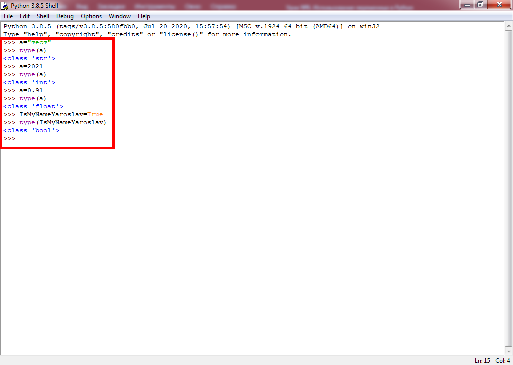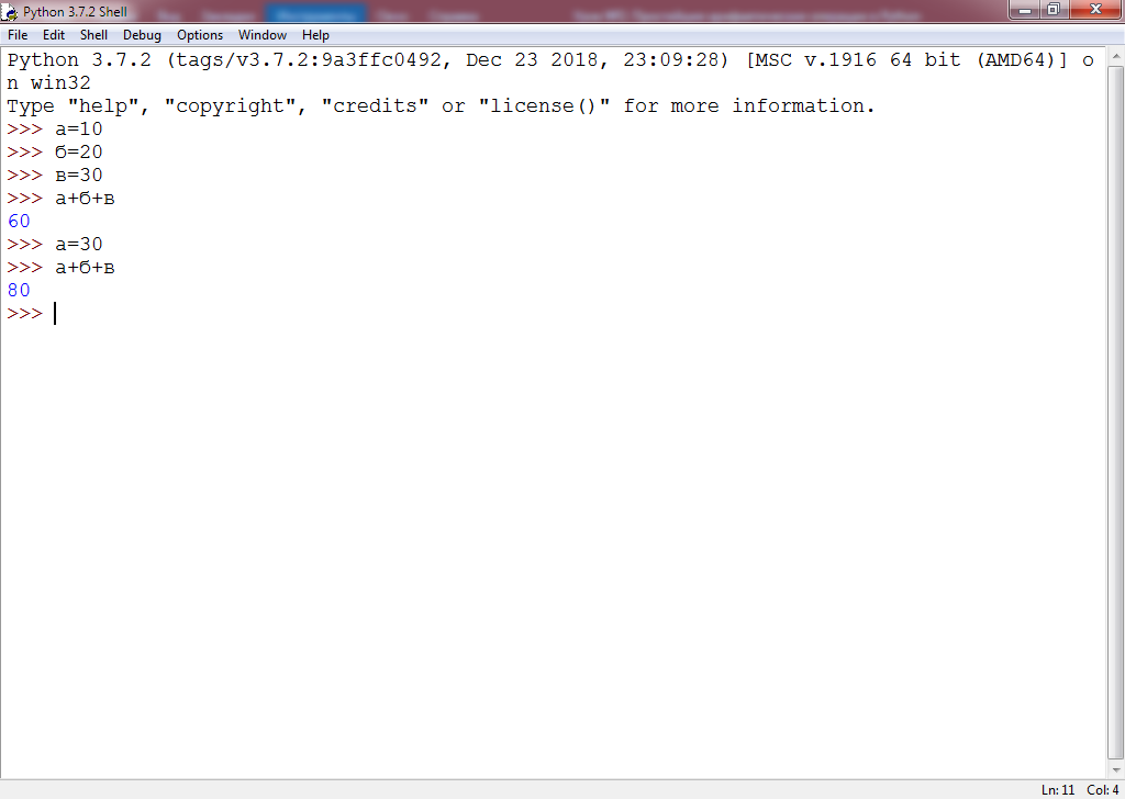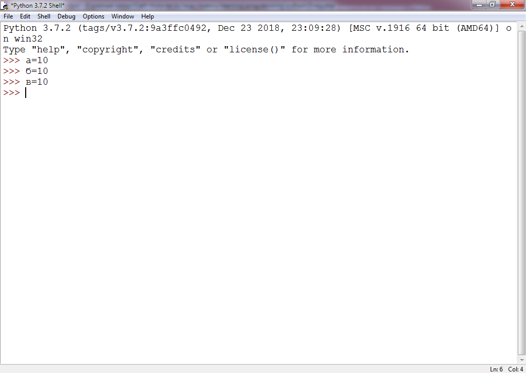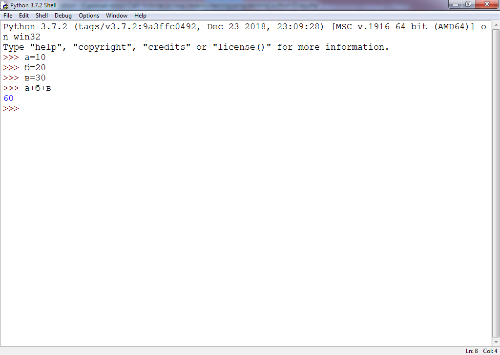 Запустите интегрированную среду разработки Python. Наберите следующие строчки кода (без нумерации строк):