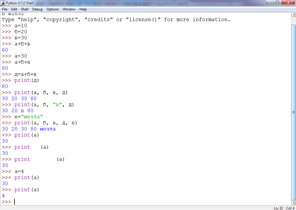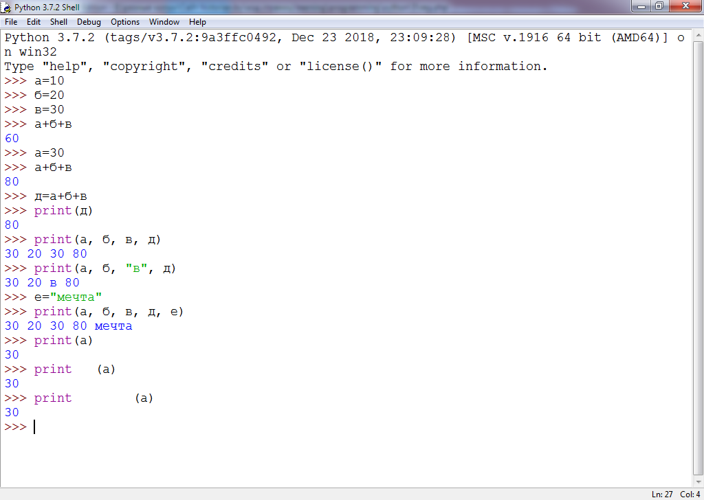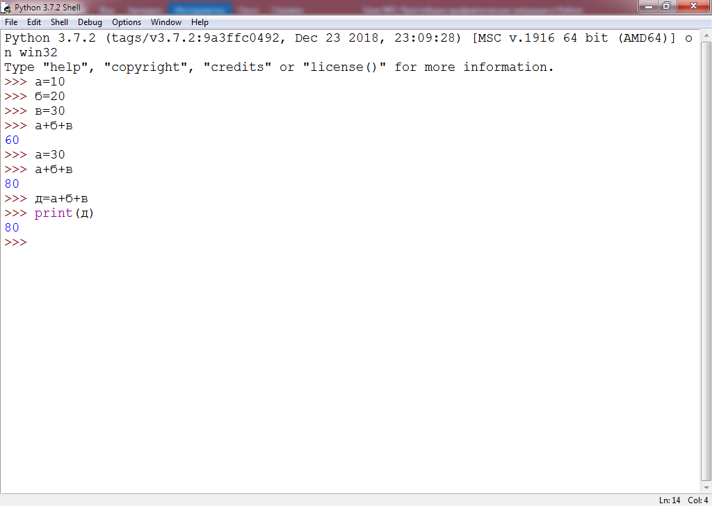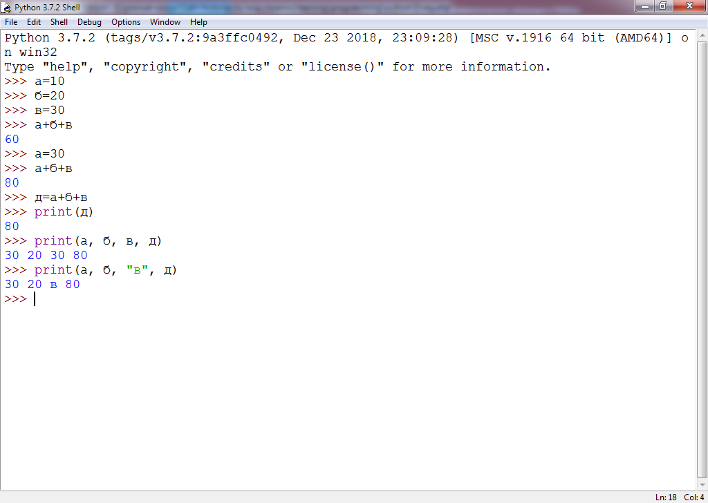 Переменной "д" мы присваиваем сумму значений трёх других переменных - "а", "б" и "в". Для просмотра значения переменной "д" необходимо воспользоваться командой "print", которая выводит информацию на экран. Наберите следующую строчку кода: