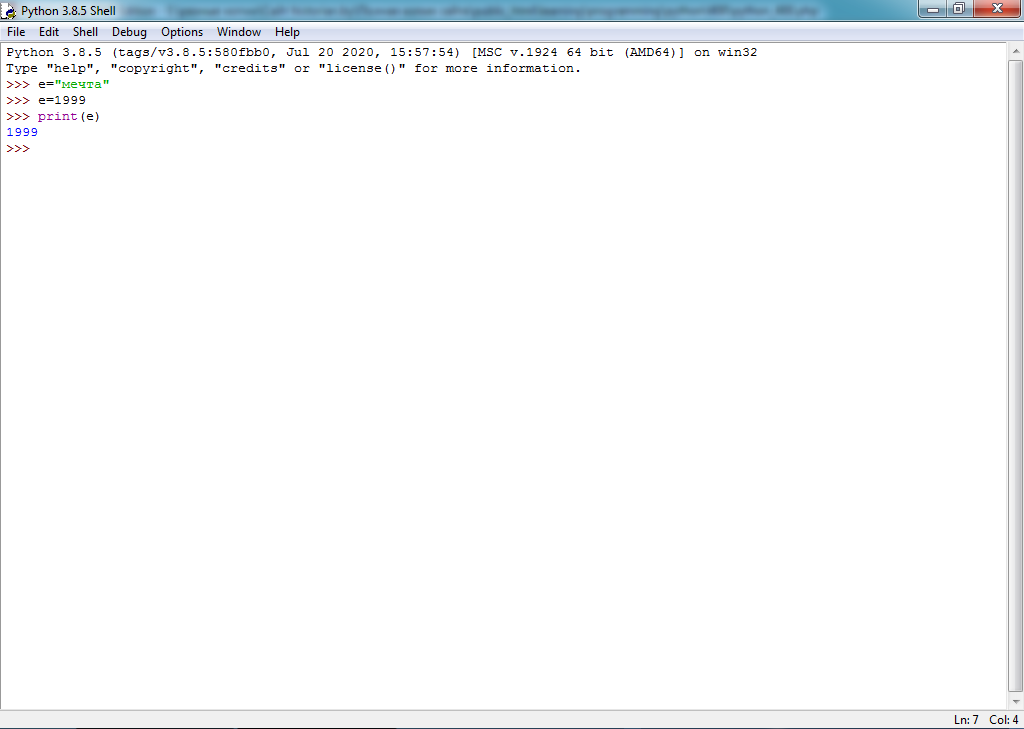 Нажмите клавишу "Ввод" ("Enter'') на клавиатуре. Обратите внимание, что текстовое значение переменной должно быть заключено в кавычки. Результат выполнения кода: 1999, поскольку переменной "е" последним было присвоено именно числовое значение.