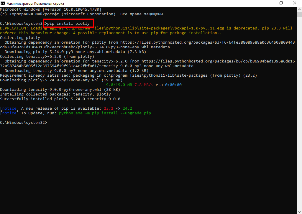 Установить Plotly можно с помощью команды pip install plotly (эту команду необходимо набрать в командной строке Windows).