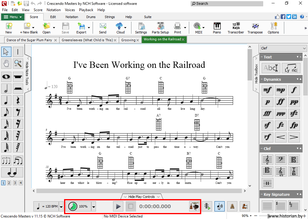 В нижней части интерфейса программы располагаются элементы управления воспроизведением, его скоростью, а также выбора инструментов, среди которых: