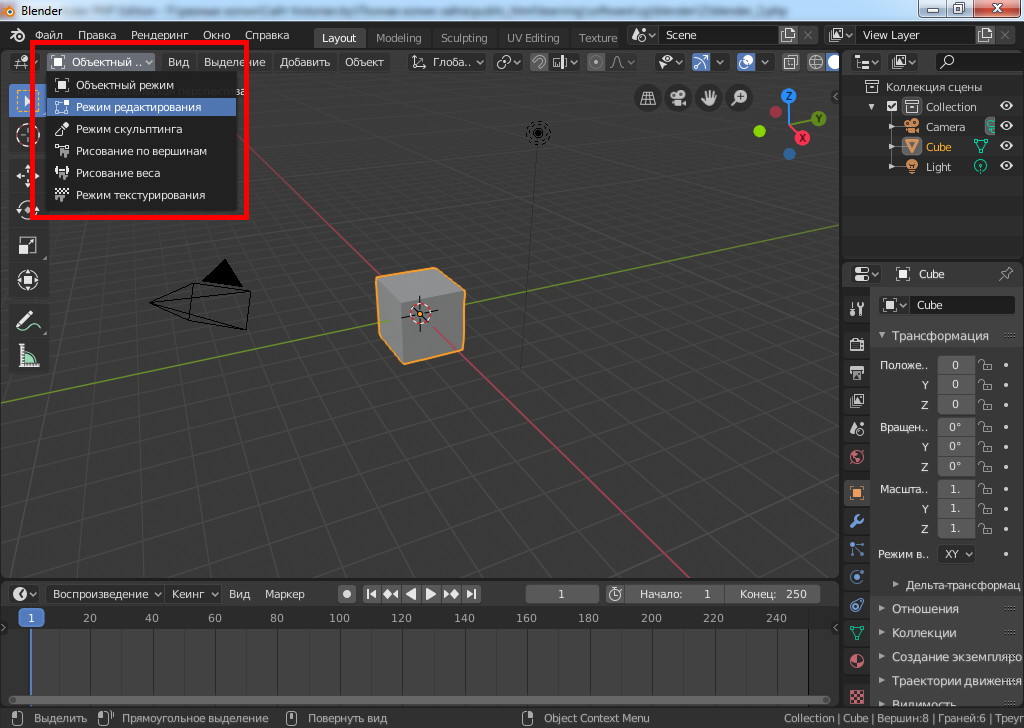 Для начала моделирования перейдите в "Режим редактирования" ("Edit Mode"). Или нажмите Tab на клавиатуре.