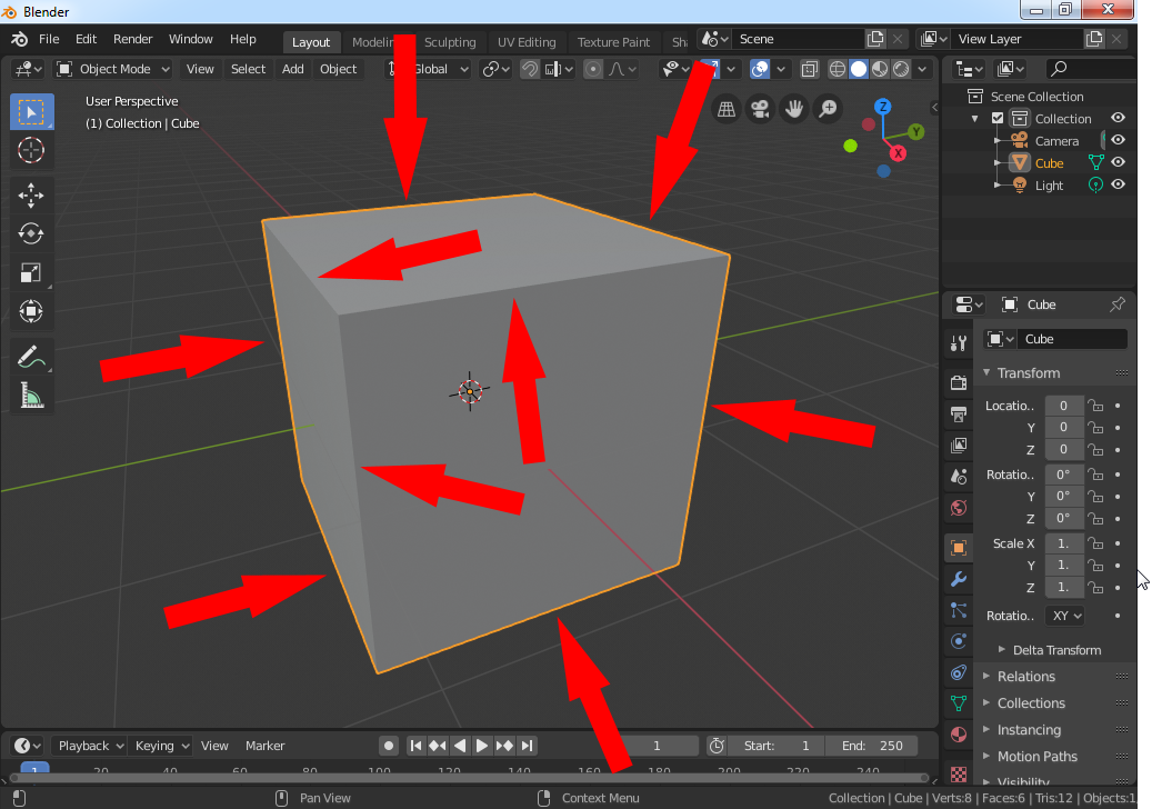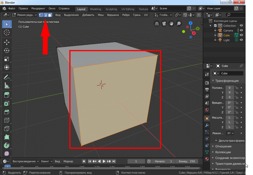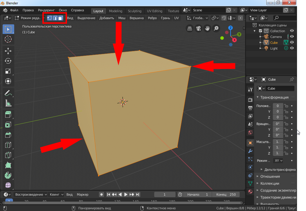 Изначально в режиме редактирования выделены все вершины (vertices) объекта. Левой клавишей мышки можно также выделить все рёбра (edges) или все грани (faces).