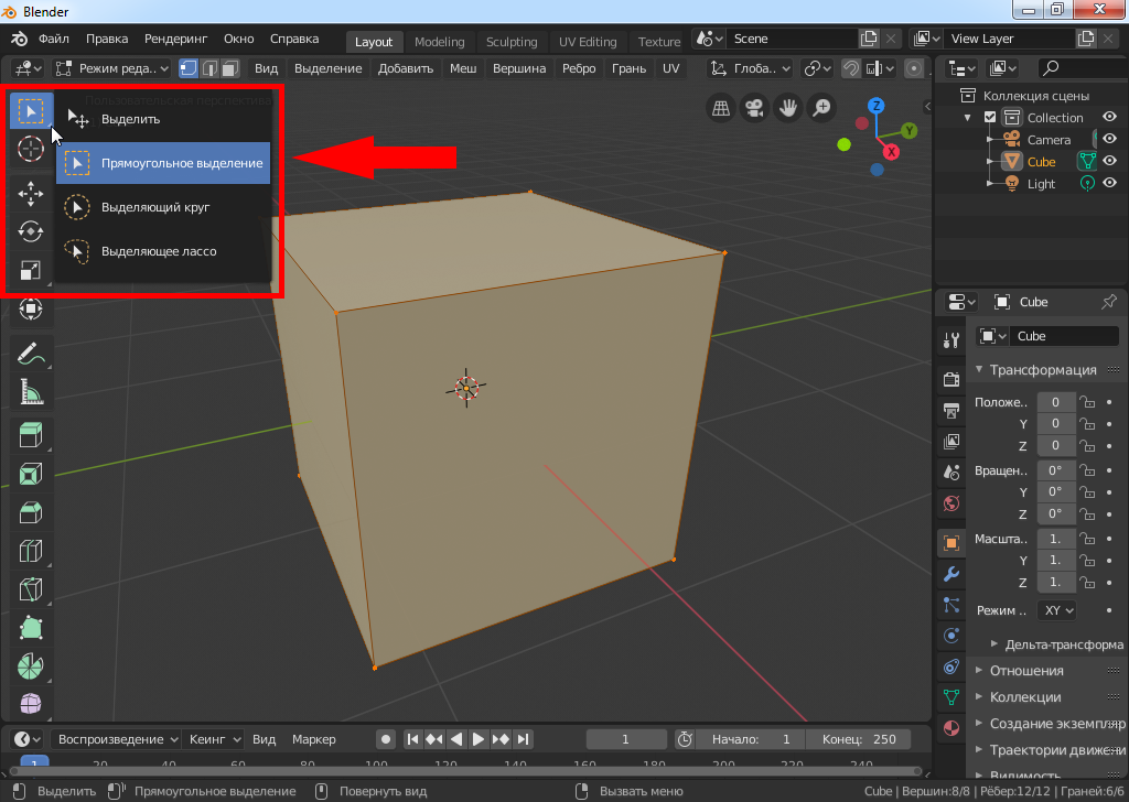 Для гибкого выбора вершин, рёбер и граней есть отдельный инструмент на соответствующей панели. Если нажать на иконку, появятся 4 варианта выделения на выбор: простое выделение, прямоугольное выделение, выделяющий круг и выделяющее лассо (произвольная форма).