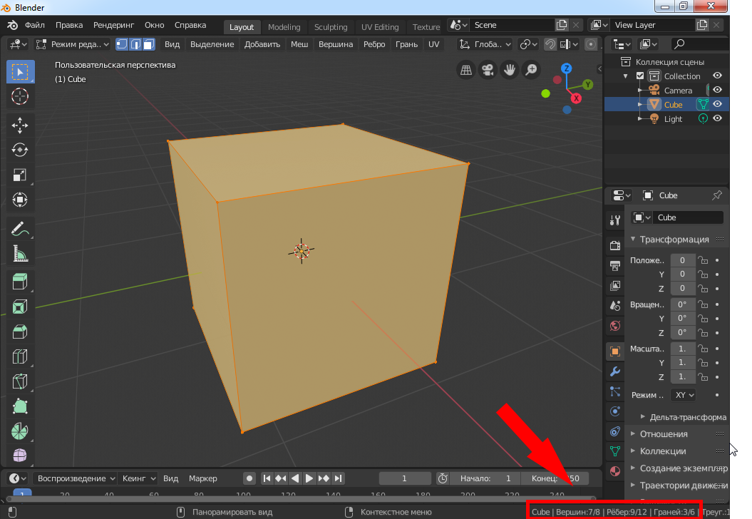 Blender в режиме реального времени показывает количество выбранных вершин (vertices), рёбер (edges) и граней (faces) из общего количества (включая те, которые не видны).