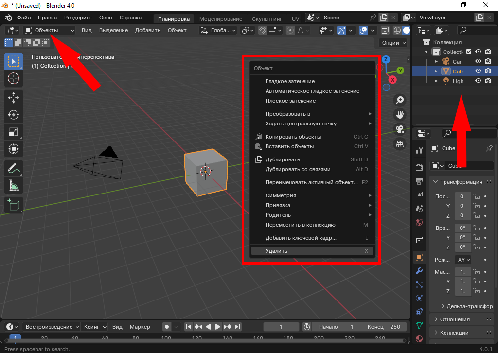 выбранного объекта сцены в структуре проекта (куб, источник света, камера и т.д.)