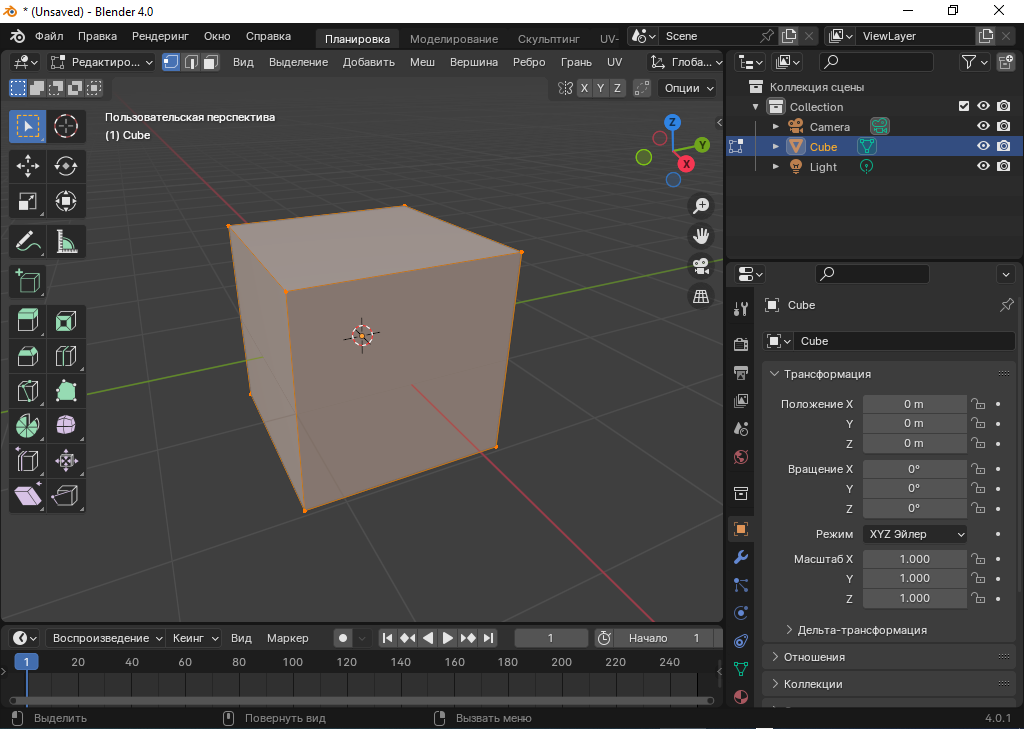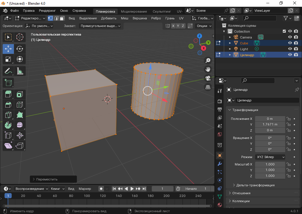 добавление примитивов (куб, конус, цилиндр, UV-сфера, икосфера)